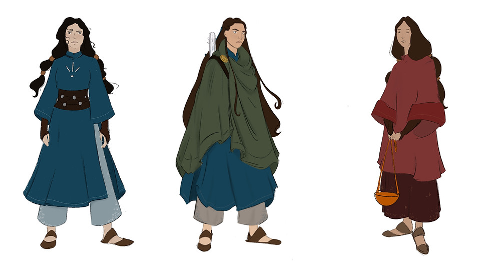 Throughout this project I wanted to experiment with shape language, I drew on inspiration from many renaissance era paintings as well as cultural ideas from the ancient world. These were a few of my favorite sketches I produced, as well as the final design. In addition to this, my main focus for this project was for costume concept designs as I found I enjoy this aspect of character design and visual development.